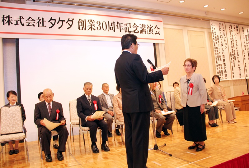 「健康は幸せの土台。健康作り事業を通して全ての皆様の幸せを応援したい」と言う株式会社タケダの指針をご理解いただき、永年にわたって代理店・特約店としてプロテサン事業の発展に多大な貢献をされた加盟継続15年以上の方々34名を対象に感謝の意を表し感謝状を贈呈しました。
