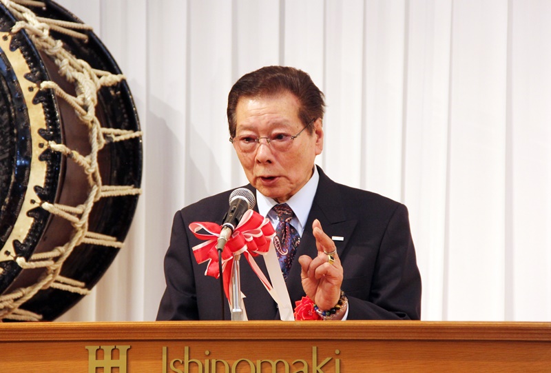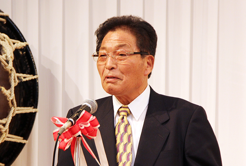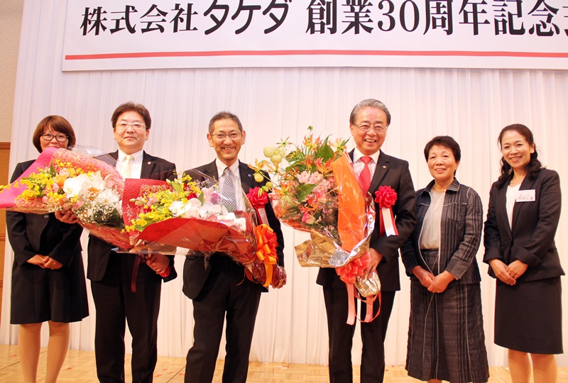 株式会社タケダを代表して武田幸一取締役会長があいさつ。「おかげさまで株式会社タケダは創業30周年を迎えることが出来ました。皆さまと共に30周年のお祝いが出来ます事、この上ない幸栄であり感謝で一杯です。この商品との出会いは、49歳で発病した妻のガンでした。『FK-23』を勧められ、藁をも掴む思いで飲み始めると、徐々に食欲が出て毎日元気に過ごせるように回復したのです」。