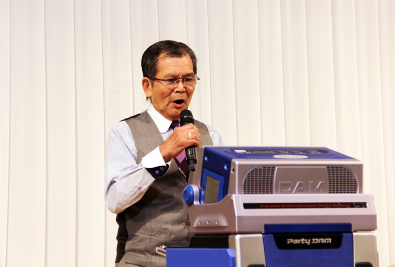 美味しい料理に舌鼓を打ちながら幕開けしたパーティーではステージでさまざまな催しが行われました。阿部弘子さん、兼重弘利さんのカラオケから始まり、第2部でも司会進行の俳優・新田純一さんの熱唱でステージを盛上げました。